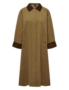 Abrigo tipo trench Only, de color kaki. Cuello clásico, marrón, al igual que los puños. Manga ranglán, cierre de botones y dos bolsillos. Corte holgado.