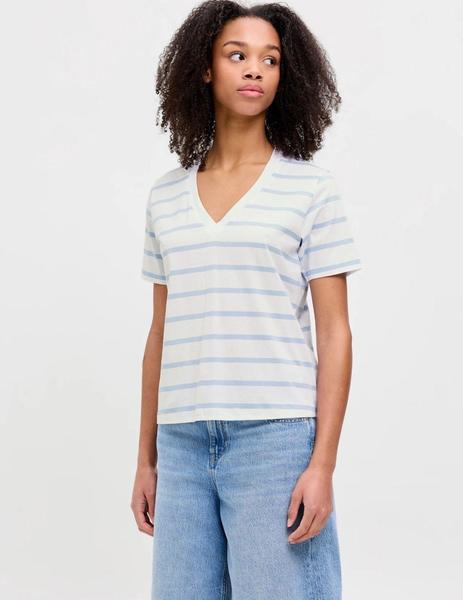 Esta camiseta es una prenda que no puede faltar en tu armario y combina con jeans, shorts y pantalones. El jersey cepillado es elástico y suave al tacto, ideal para vestir a diario. - Artículo : Camiseta - Cuello : Cuello en V - Manga : Manga corta - Corte : Corte regular 50% Algodón orgánico, 50% Algodón Proceso muy suave a una temperatura máxima de 40°C No usar lejía Planchar a una temperatura máxima de 150ºC Secar en vertical Se puede secar en la secadora a temperatura baja No lavar en seco Lavar con prendas de colores similares